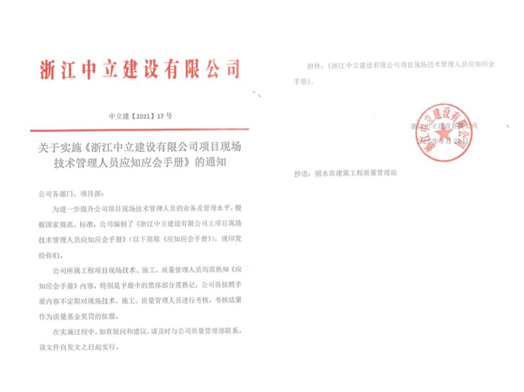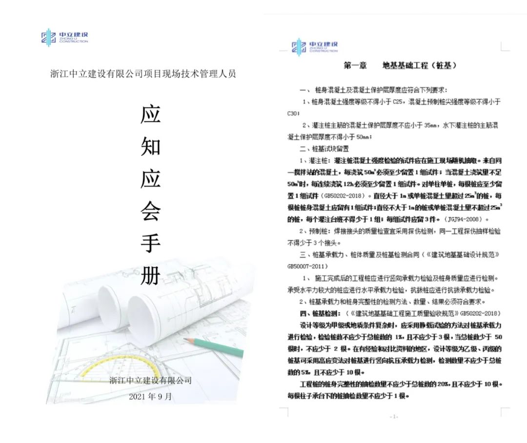 為進(jìn)一步提升公司項(xiàng)目現(xiàn)場(chǎng)技術(shù)管理人員的整體業(yè)務(wù)和管理水平,積極開(kāi)展“質(zhì)量月”活動(dòng),根據(jù)國(guó)家標(biāo)準(zhǔn)規(guī)范,中立建設(shè)編制了《浙江中立建設(shè)有限公司工項(xiàng)目現(xiàn)場(chǎng)技術(shù)管理人員應(yīng)知應(yīng)會(huì)手冊(cè)》,并于9月23日發(fā)文實(shí)施。這是繼今年6月份我公司出臺(tái)的《工程質(zhì)量通病防治(2021試行)》后的又一重要技術(shù)性手冊(cè)。